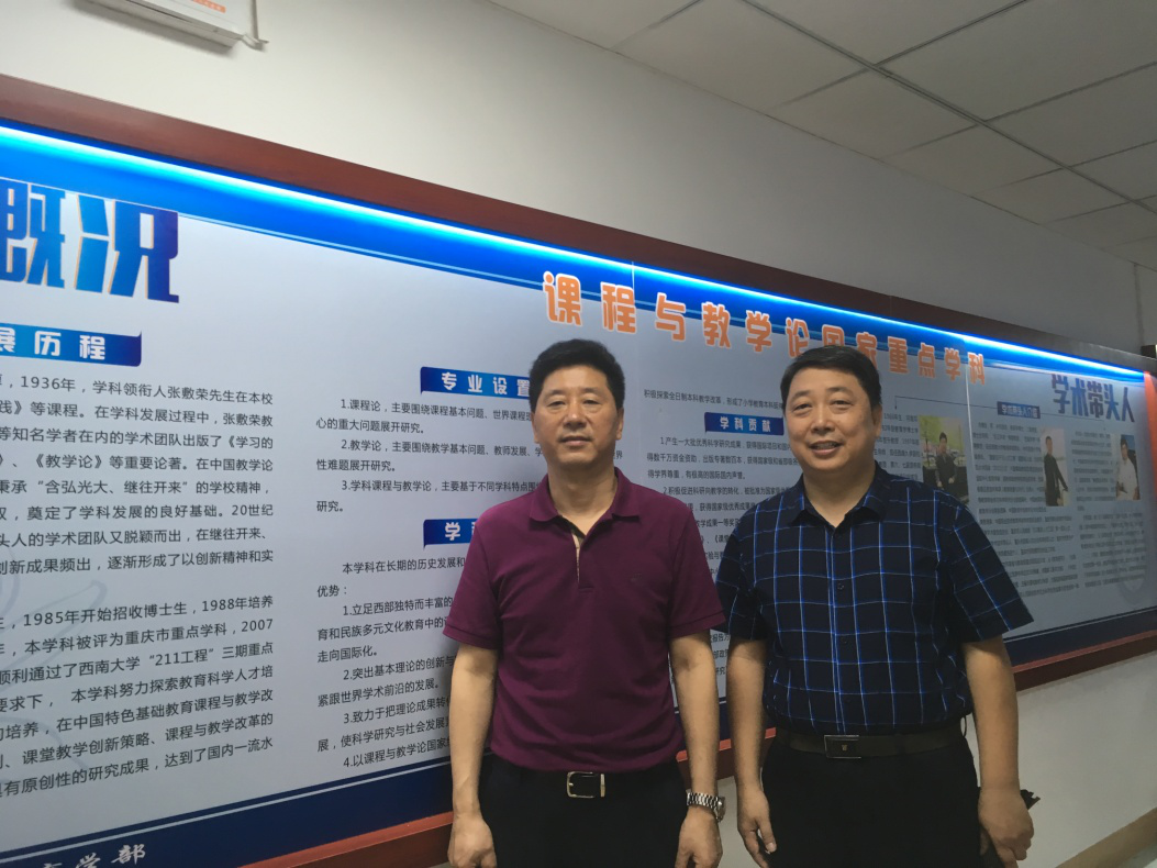 7月8日,索磊专程拜访西南大学副校长靳玉乐教授,请教教育学学科建设事宜。靳玉乐教授是国务院学位委员会教育学科评议组成员、首批新世纪“百千万人才工程”国家级人选,享受国务院政府特殊津贴专家,首批重庆市“两江学者计划”特聘教授,“课程与教学论”国家重点学科带头人,“课程与教学论”国家级教学团队带头人,国家精品资源课程《课程与教学论》主持人。索磊介绍了教育学学科建设基本情况和面临的困境。靳玉乐教授针对我院教育学科发展的现状,就学科特色方向凝练、学术成果水平提升、科研团队建设、奖励机制建立等对我院教育学学科建设面临的问题做了具体指导。