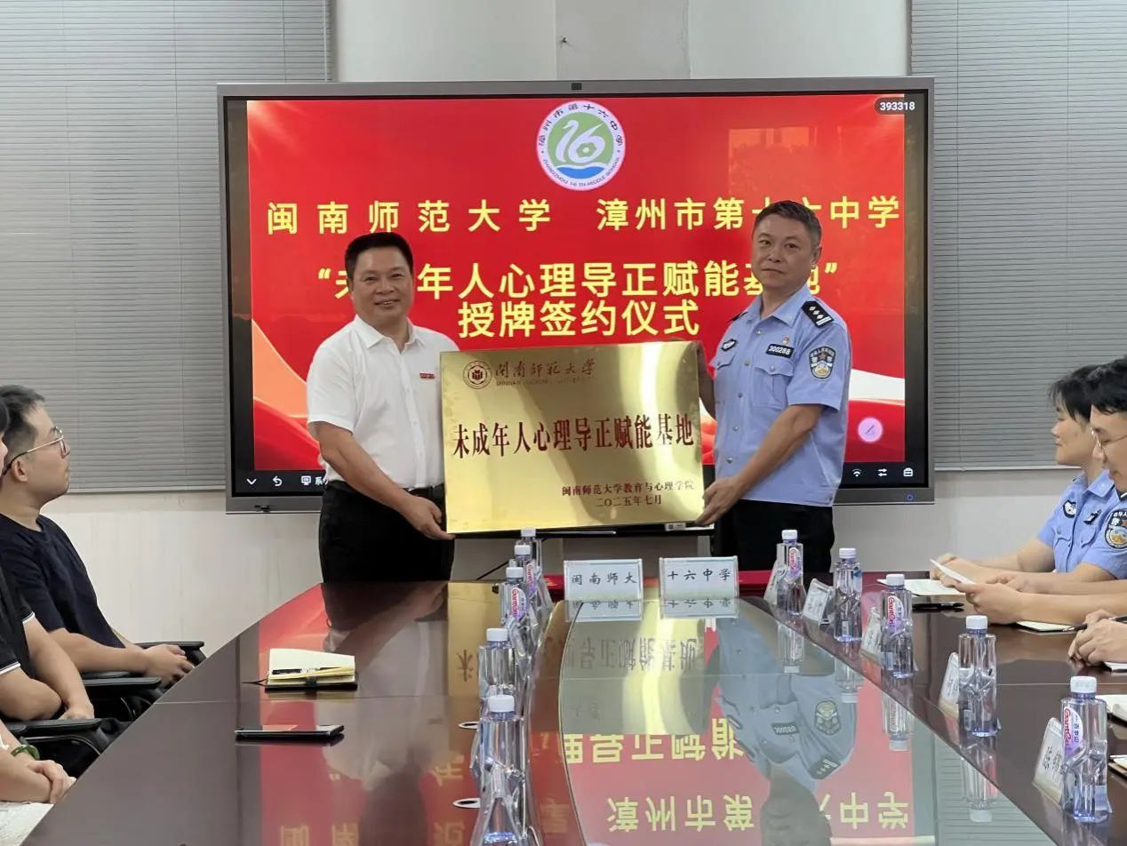 为切实推进未成年人心理健康教育,探索未成年人问题心理与行为的有效导正路径,7 月 31 日我院与漳州市第十六中学正式签约授牌共建“未成年人心理导正赋能基地”。院党委副书记、院长陈顺森代表我院向漳州十六中支部书记陈锦辉授牌,院党委副书记杨君玉与漳州十六中王国雄副校长签署实践基地协议书,确立“相互协作、资源共享、共同发展”的合作原则。漳州市十六中书记陈锦辉、副校长何锦皇、王国雄,漳州市教育局安全科四级主任科员邹志鹏等出席活动。