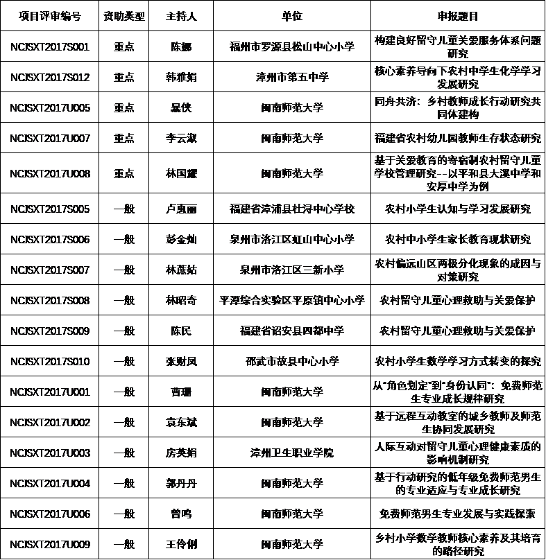 根据福建省区域农村教师发展协同创新中心管理办法,经我中心组织专家严格评审和面向社会公示,现将立项结果予以公布。其中,重点项目5项、一般项目12项,纳入2018年度协同中心开放课题管理。现将立项课题公布如下。